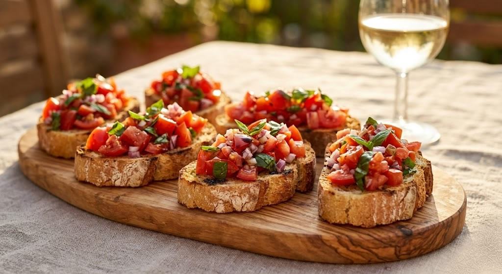 A bruschetta é a sofisticação da simplicidade. Para essa receita, o pão duro é essencial; ele precisa ser tostado para aguentar o peso e a umidade do recheio. O clássico é tomate e manjericão, mas você pode usar a criatividade com o que tiver na geladeira.