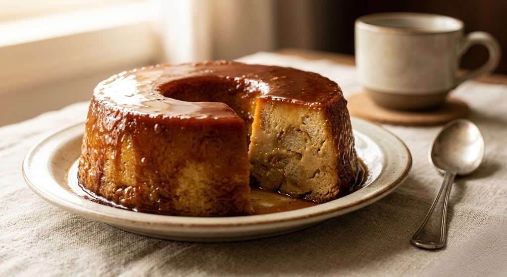 Essa receita tem gosto de infância. O pudim de pão é uma das formas mais antigas e eficazes de reaproveitar pão duro. O pão é embebido no leite até desmanchar, criando uma textura cremosa e densa que contrasta com a calda de caramelo. É uma sobremesa que custa centavos e agrada a todos.
