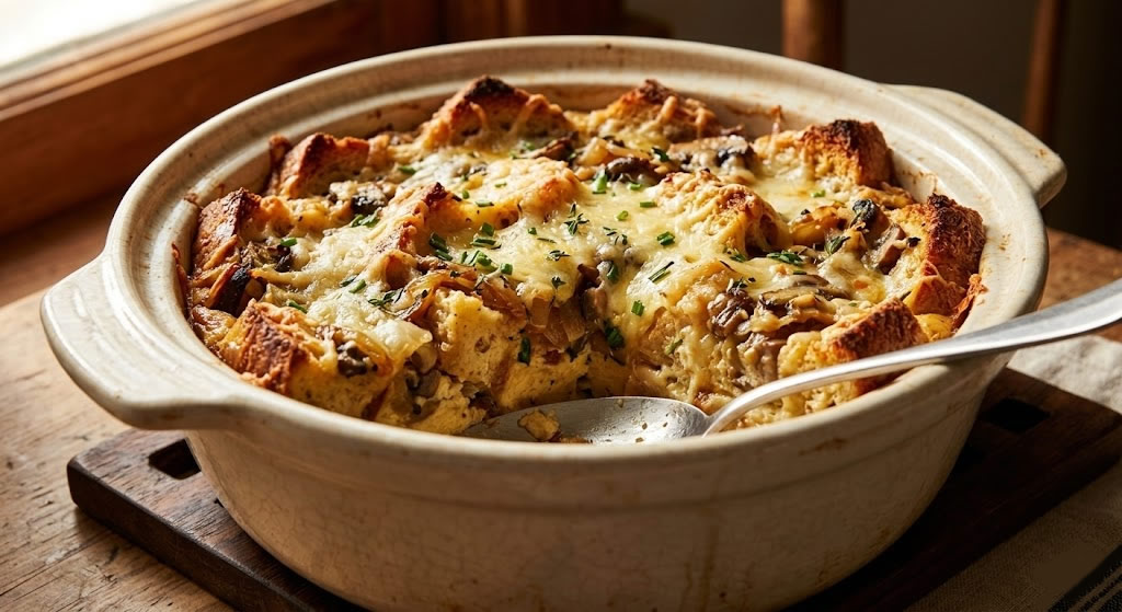 Uma torta salgada feita com base de pão duro é a “torta de sobras” definitiva. O pão cortado em fatias ou cubos forma uma base que absorve um creme (leite + ovos) e assa junto com o recheio de sua preferência. É uma refeição completa, quente e reconfortante, que transforma “nada” em “tudo”.